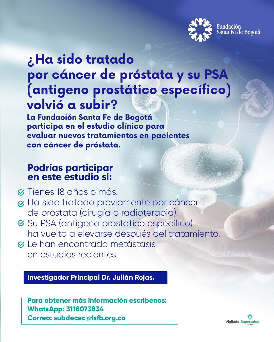 La Fundación Santa Fe de Bogotá participa en un ensayo clínico donde los investigadores están evaluando un medicamento en investigación para pacientes con cáncer de próstata.