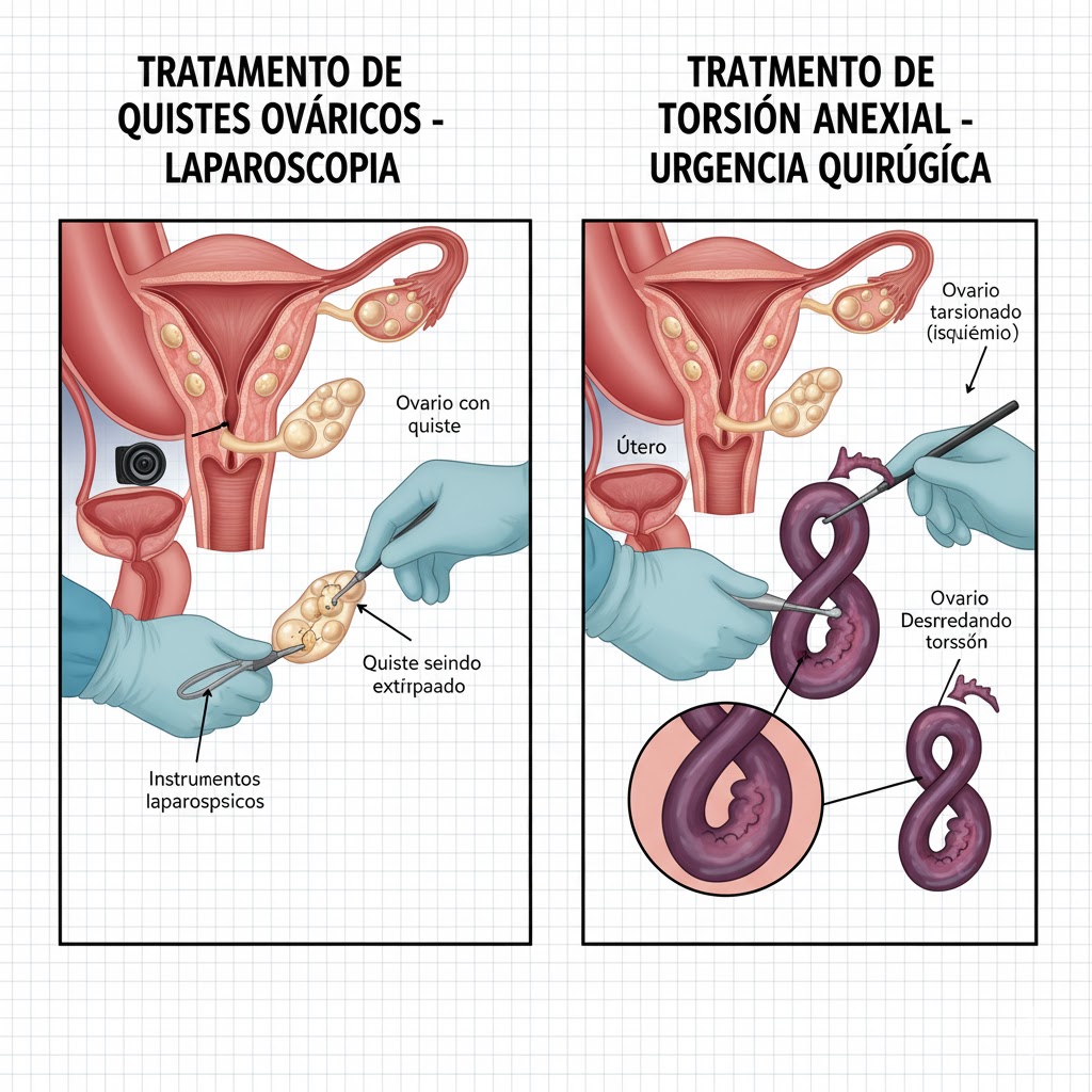 La torsión anexial ocurre cuando un ovario (con o sin quiste) se tuerce sobre sus ligamentos, bloqueando el flujo de sangre. Es una emergencia ginecológica que requiere cirugía inmediata para evitar la pérdida del ovario.